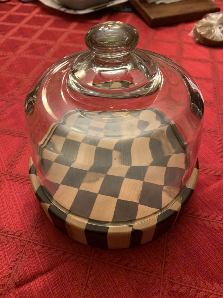 I also found a small cheese platter with a terrible warped base and nice glass dome. Because the board was stained and made of some unknown wood I decided to discard it and start over. I wanted this to be a little special so I decided to do my first end-grain cutting board out of Maple and Walnut in a checkerboard.. I cut it into a circle on my CNC machine and finished it with a beeswax blend. This should give years of service down the road and looks beautiful to boot.